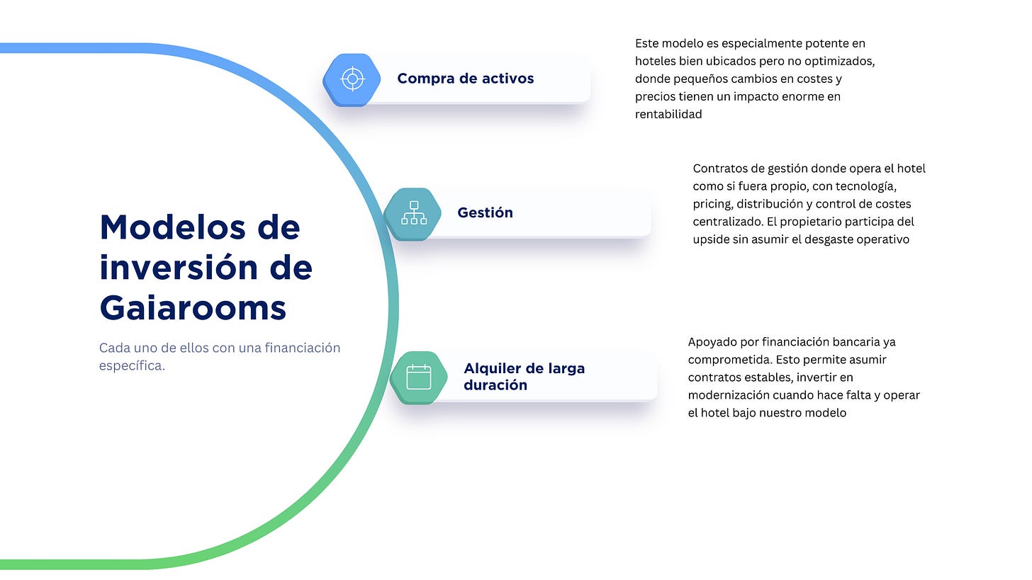 Aquí entra el modelo de alquiler a largo plazo, apoyado por financiación bancaria ya comprometida. Esto nos permite asumir contratos estables, invertir en modernización cuando hace falta y operar el hotel bajo nuestro modelo.